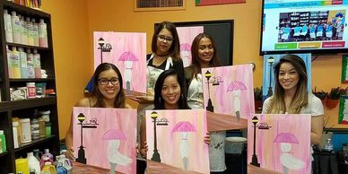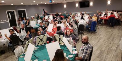 In-studio, private sessions are available. You pick the painting and the studio is reserved for you and your guests. Private events are booked with a minimum of 5 and a maximum of 15.